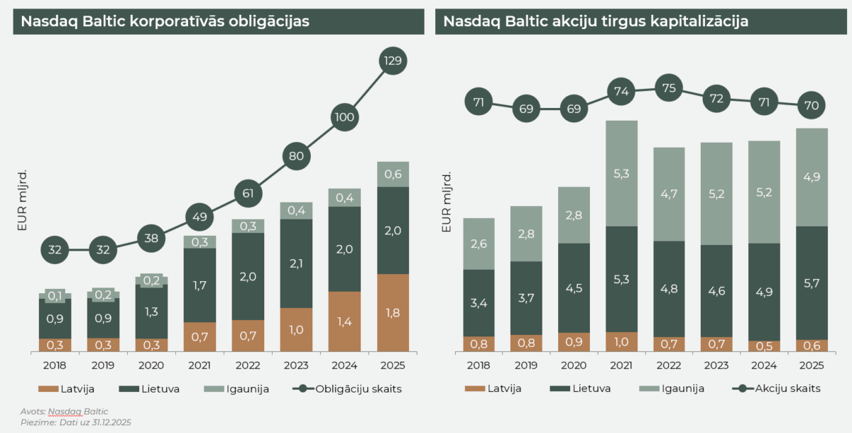 2025. gads Baltijas kapitāla tirgū iezīmējās ar ievērojamu obligāciju emisiju aktivitāti – tika sasniegti rekordi gan piesaistītajā finansējuma apjomā, gan uzņēmumu skaitā, kas emitēja obligācijas. Savukārt 2025. gads akciju tirgū ir atnesis tikai vienu akciju emitentu. Kopumā Baltijas uzņēmumi emitēja obligācijas 6,68 mljrd. eiro apjomā, kas ir 2.2x pieaugums salīdzinājumā ar 2024. gadu.